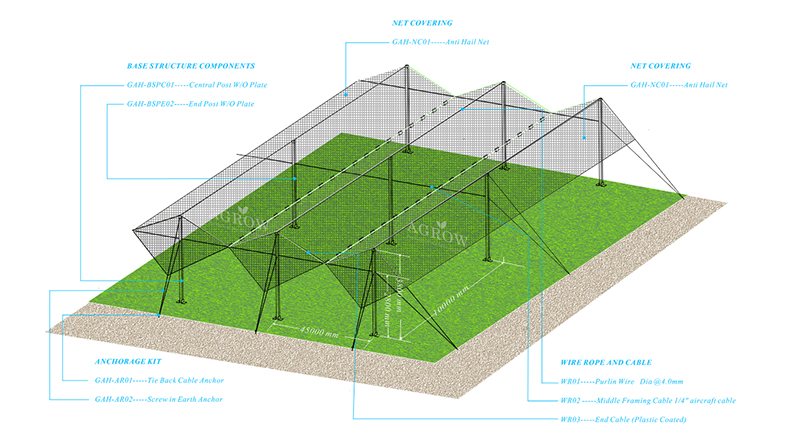 Bij AGROW bieden we verschillende systemen voor boomgaarden, van het traditionele hellende systeem tot het vlakke systeem. Alle netafdeksystemen bestaan uit een trekstructuur bestaande uit verticale steunen die met elkaar zijn verbonden door middel van een kabel of kabel, en gespannen worden gehouden door een anker in de grond en een anker met verankeringskabel en grondankers. Het net wordt over de rijen fruitplanten gelegd en met speciale hardware en accessoires aan de structuur bevestigd.